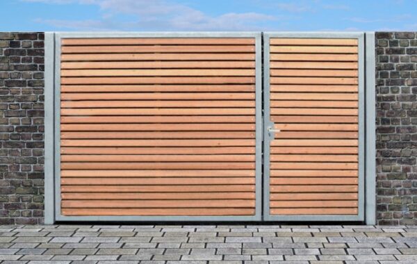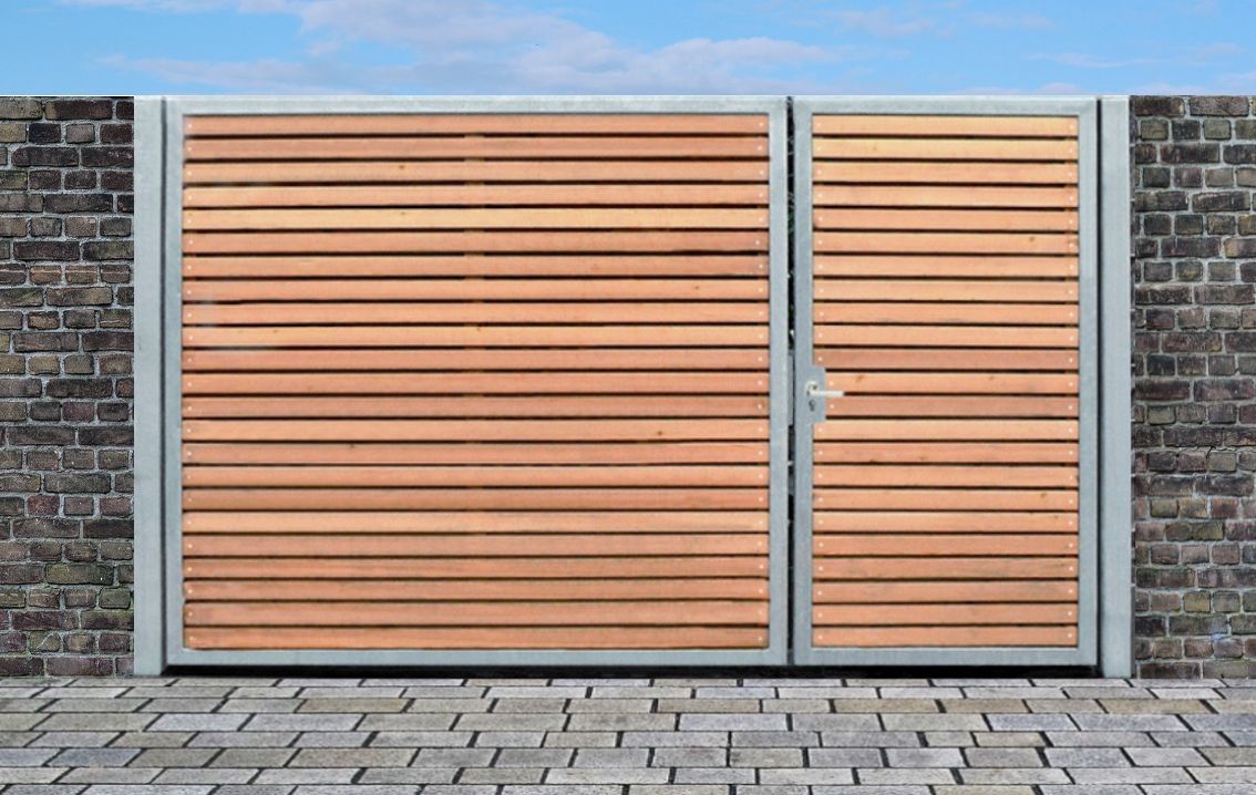 <h2>Einfahrtstor Qas Tor Verzinkt mit Pfosten & Holzfüllung 2-flügelig 350cm x 180cm</h2>